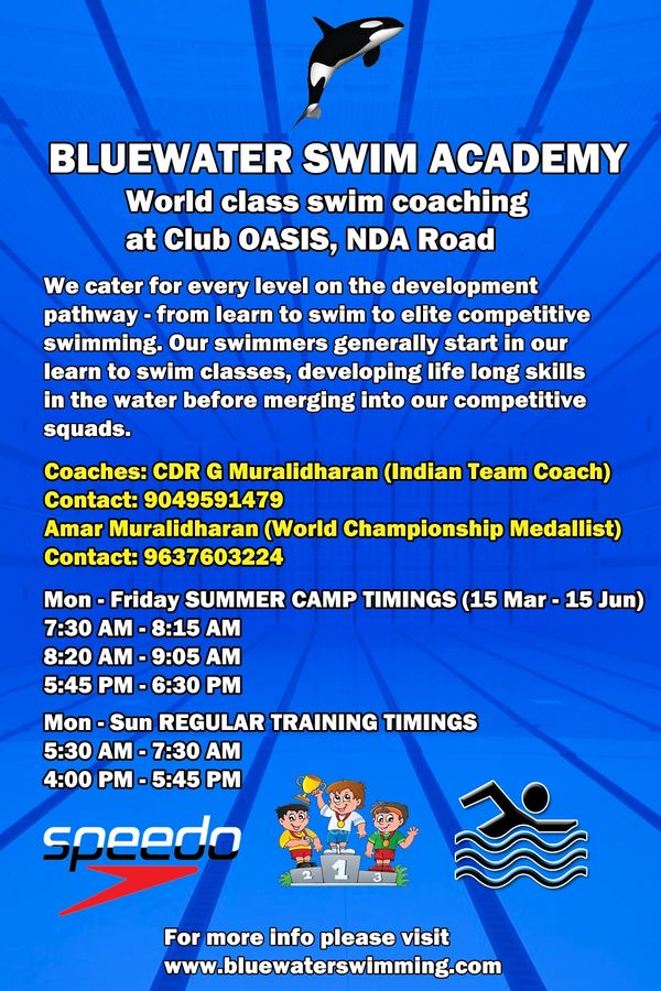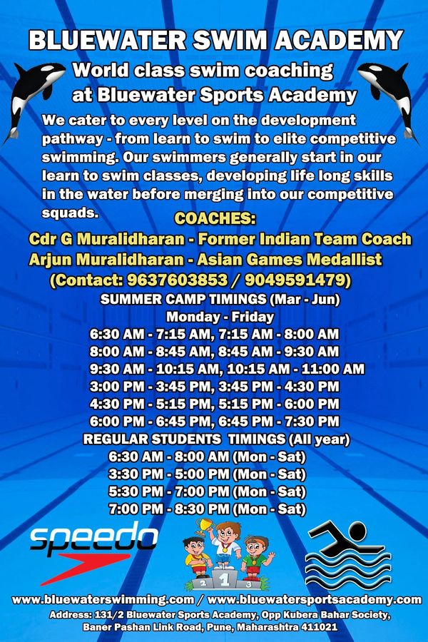 Join the premier elite Bluewater Swim Academy at Baner Pashan or Warje swim classes for beginner (learn to swim) & competitive batch swimming classes.